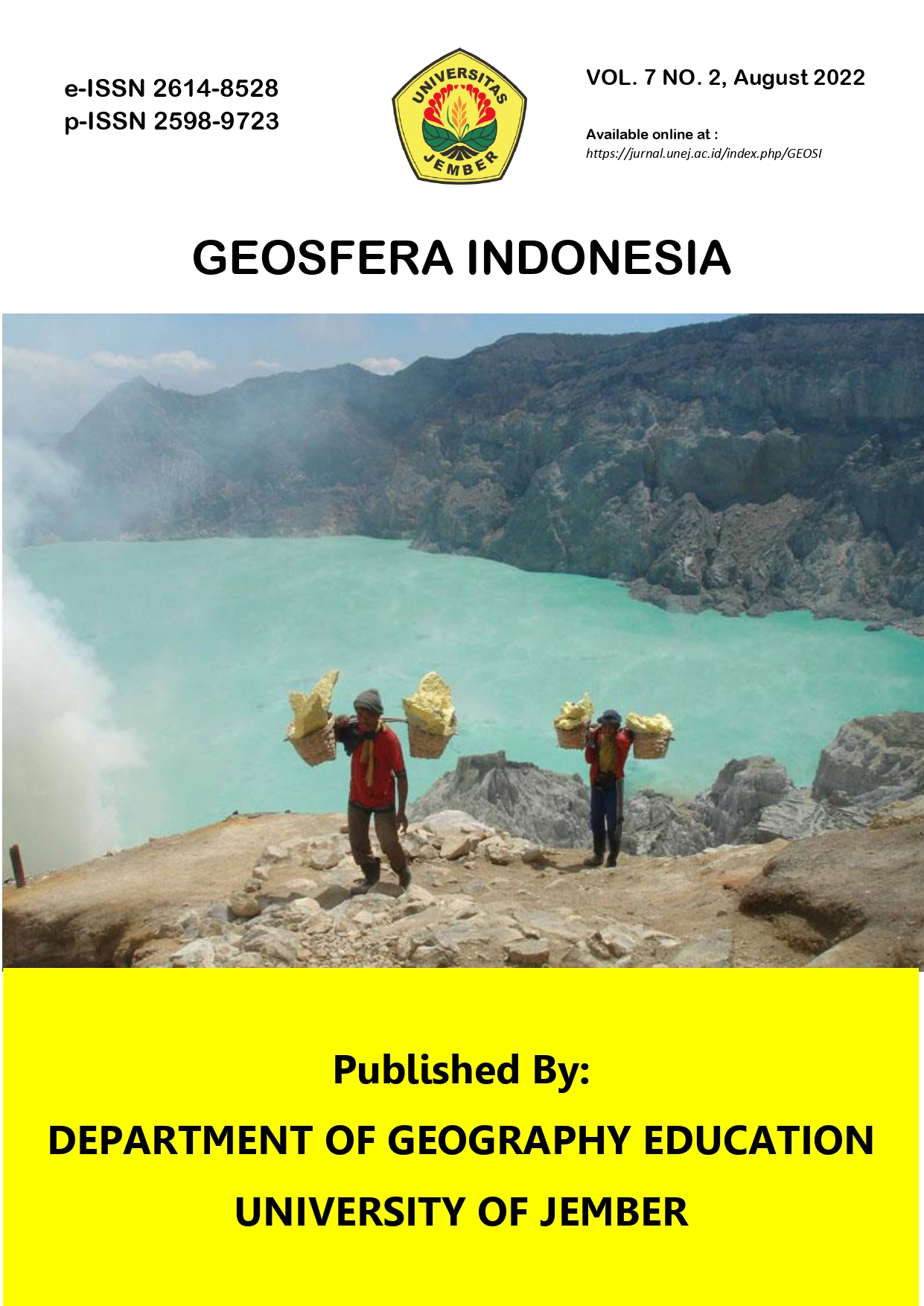 Vol. 7 No. 2 (2022)Geosfera Indonesia (Journal Initial : GEOSI) : | ISSN: 2598-9723 (Print)| ISSN: 2614-8528 (Online) is an international open access and peer-reviewed journal, published by Department of Geography Education, University of Jember, Indonesia. It is published three times a year in April, August, and December. Geosfera Indonesia is a journal publishes original research, review, and short communication (written by researchers, academicians, professional, and practitioners from all over the world) which utilizes geographic and environment approaches (human, physical landscape, nature-society and GIS) to resolve human-environment interaction problems... View full aims and scope