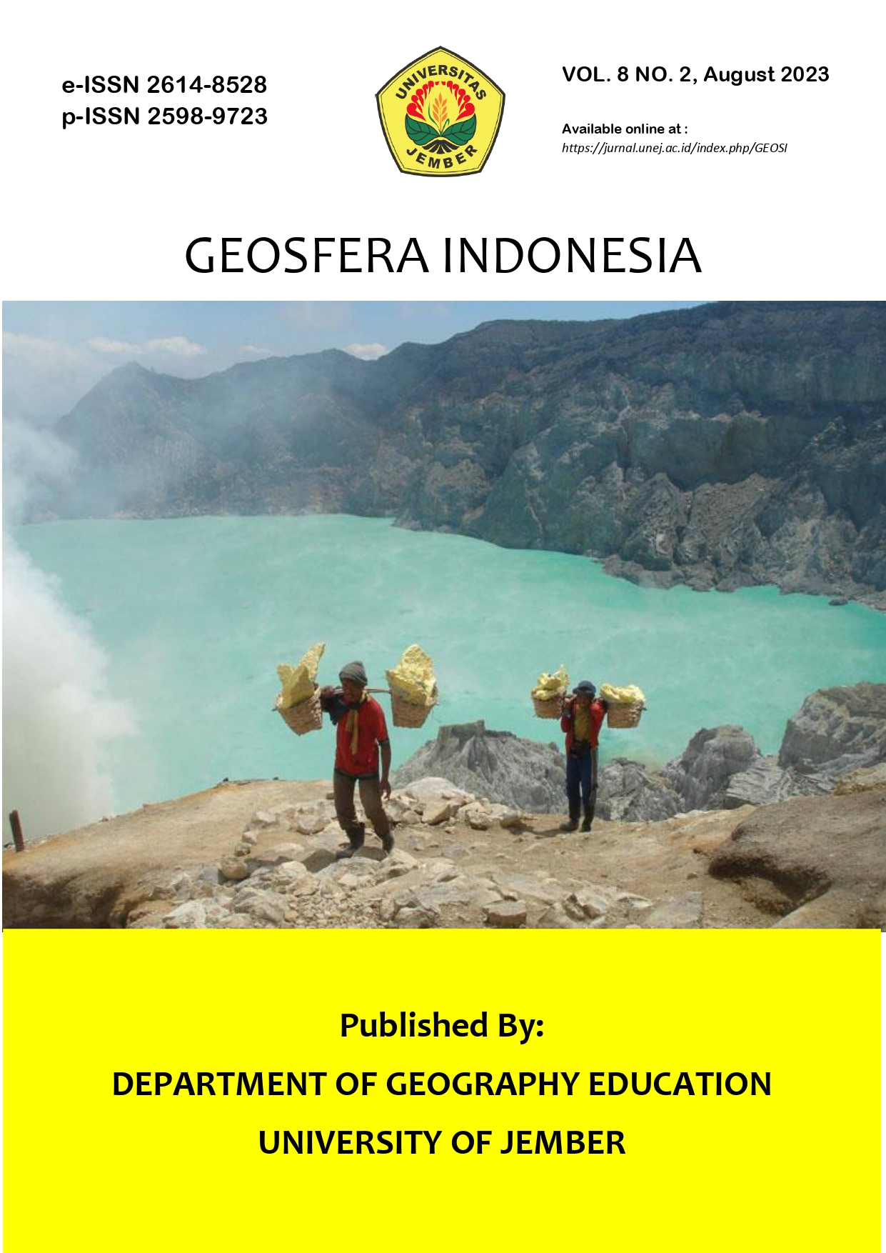 Vol. 8 No. 1 (2023)Geosfera Indonesia (Journal Initial : GEOSI) : | ISSN: 2598-9723 (Print)| ISSN: 2614-8528 (Online) is an international open access and peer-reviewed journal, published by Department of Geography Education, University of Jember, Indonesia. It is published three times a year in April, August, and December. Geosfera Indonesia is a journal publishes original research, review, and short communication (written by researchers, academicians, professional, and practitioners from all over the world) which utilizes geographic and environment approaches (human, physical landscape, nature-society and GIS) to resolve human-environment interaction problems... View full aims and scope