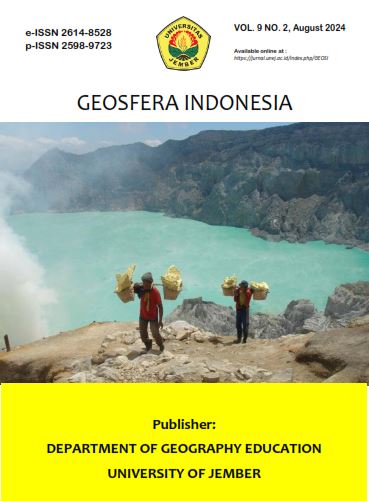 Vol. 10 No. 2 (2025)Geosfera Indonesia (Journal Initial : GEOSI) : | ISSN: 2598-9723 (Print)| ISSN: 2614-8528 (Online) is an international open access and peer-reviewed journal, published by Department of Geography Education, University of Jember, Indonesia. It is published three times a year in April, August, and December. Geosfera Indonesia is a journal publishes original research, review, and short communication (written by researchers, academicians, professional, and practitioners from all over the world) which utilizes geographic and environment approaches (human, physical landscape, nature-society and GIS) to resolve human-environment interaction problems... View full aims and scope