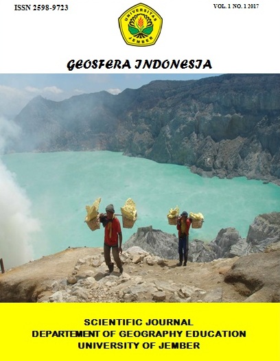 Vol. 2 No. 1 (2018)Geosfera Indonesia (Journal Initial : GEOSI) : | ISSN: 2598-9723 (Print)| ISSN: 2614-8528 (Online) is an international open access and peer-reviewed journal, published by Department of Geography Education, University of Jember, Indonesia. It is published three times a year in April, August, and December. Geosfera Indonesia is a journal publishes original research, review, and short communication (written by researchers, academicians, professional, and practitioners from all over the world) which utilizes geographic and environment approaches (human, physical landscape, nature-society and GIS) to resolve human-environment interaction problems... View full aims and scope