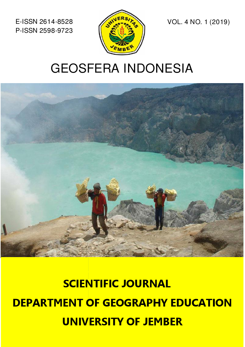 Vol. 4 No. 1 (2019)Geosfera Indonesia (Journal Initial : GEOSI) : | ISSN: 2598-9723 (Print)| ISSN: 2614-8528 (Online) is an international open access and peer-reviewed journal, published by Department of Geography Education, University of Jember, Indonesia. It is published three times a year in April, August, and December. Geosfera Indonesia is a journal publishes original research, review, and short communication (written by researchers, academicians, professional, and practitioners from all over the world) which utilizes geographic and environment approaches (human, physical landscape, nature-society and GIS) to resolve human-environment interaction problems... View full aims and scope