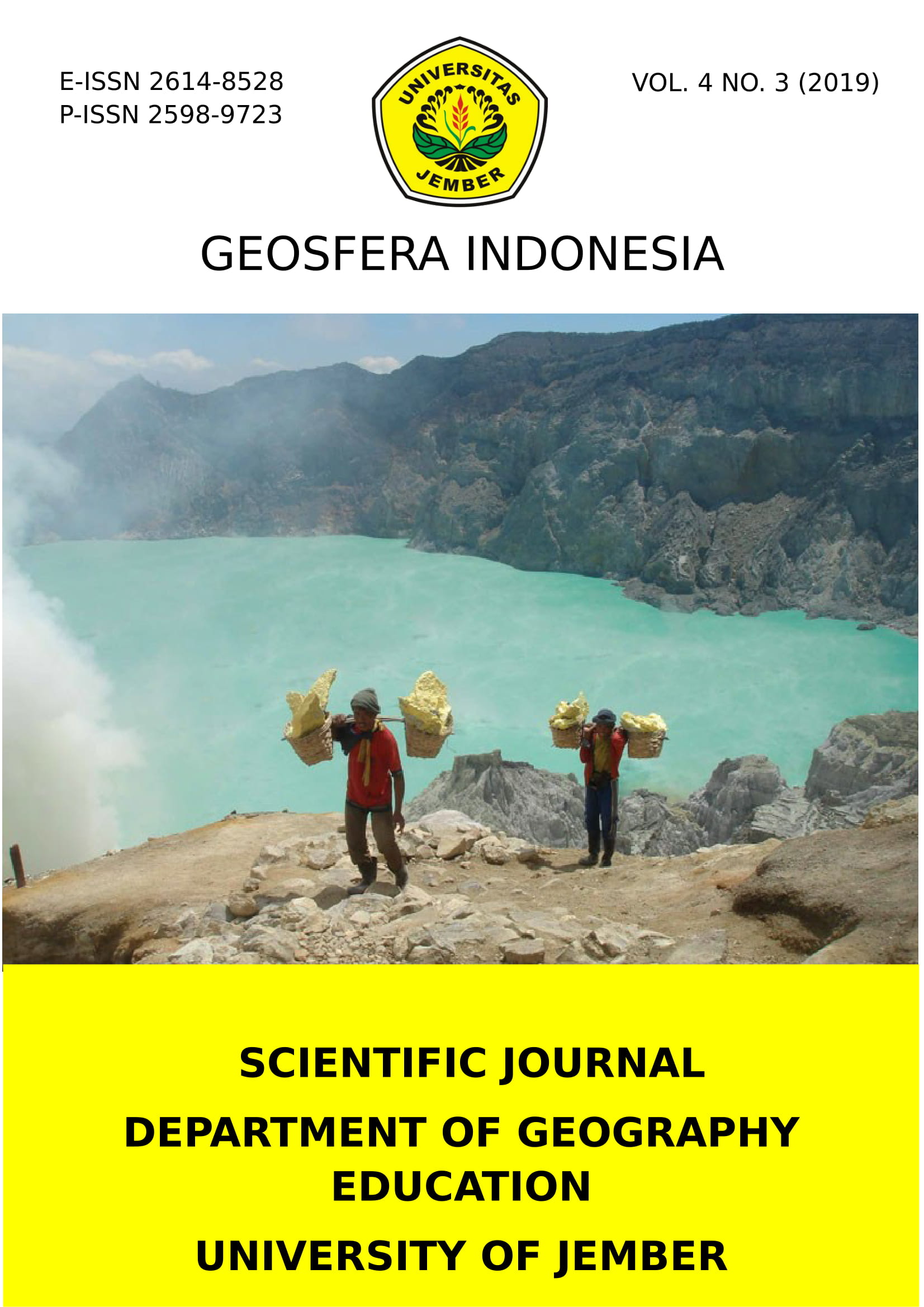 Vol. 4 No. 3 (2019)Geosfera Indonesia (Journal Initial : GEOSI) : | ISSN: 2598-9723 (Print)| ISSN: 2614-8528 (Online) is an international open access and peer-reviewed journal, published by Department of Geography Education, University of Jember, Indonesia. It is published three times a year in April, August, and December. Geosfera Indonesia is a journal publishes original research, review, and short communication (written by researchers, academicians, professional, and practitioners from all over the world) which utilizes geographic and environment approaches (human, physical landscape, nature-society and GIS) to resolve human-environment interaction problems... View full aims and scope