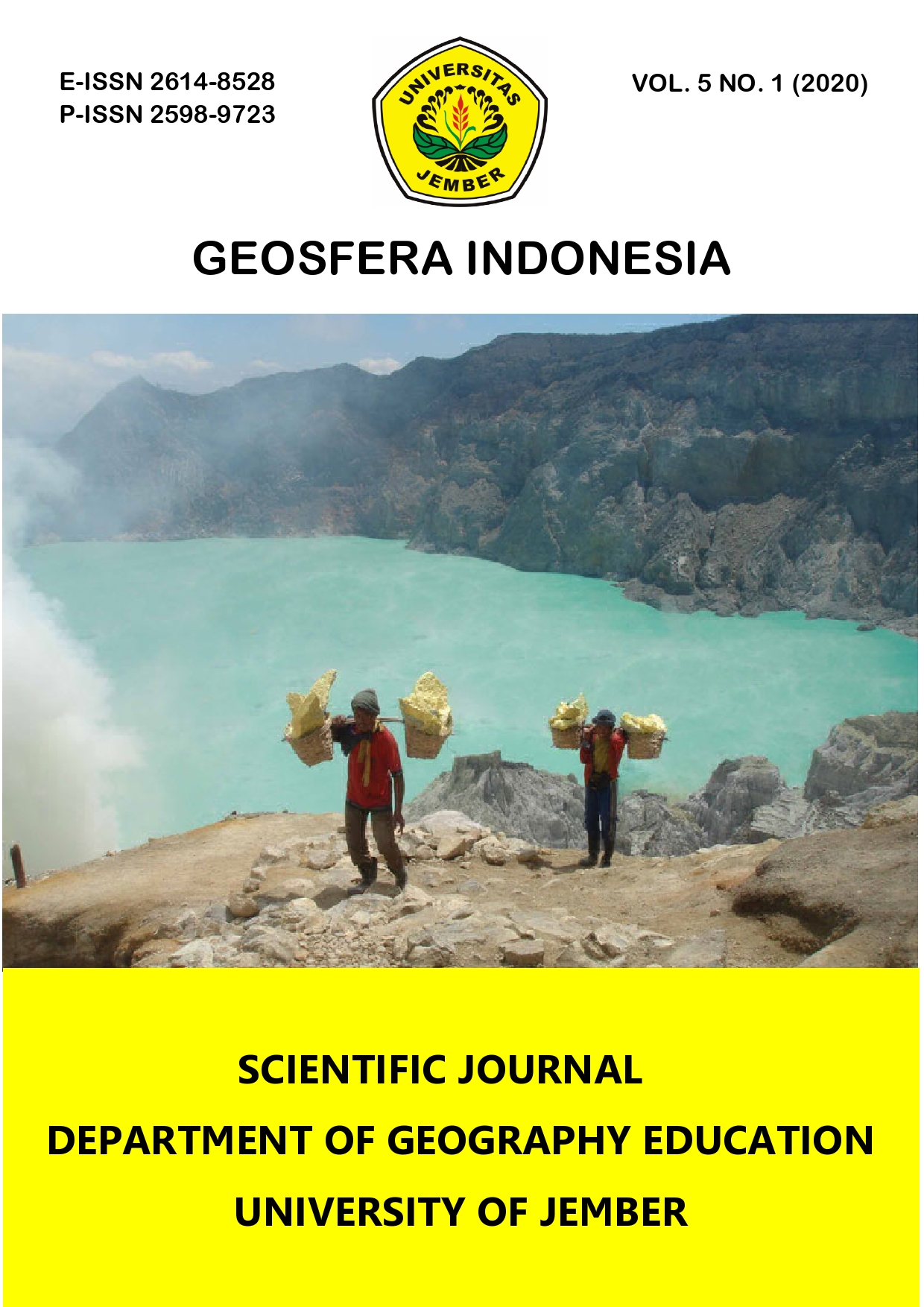 Vol. 5 No. 1 (2020)Geosfera Indonesia (Journal Initial : GEOSI) : | ISSN: 2598-9723 (Print)| ISSN: 2614-8528 (Online) is an international open access and peer-reviewed journal, published by Department of Geography Education, University of Jember, Indonesia. It is published three times a year in April, August, and December. Geosfera Indonesia is a journal publishes original research, review, and short communication (written by researchers, academicians, professional, and practitioners from all over the world) which utilizes geographic and environment approaches (human, physical landscape, nature-society and GIS) to resolve human-environment interaction problems... View full aims and scope